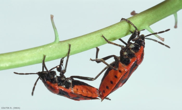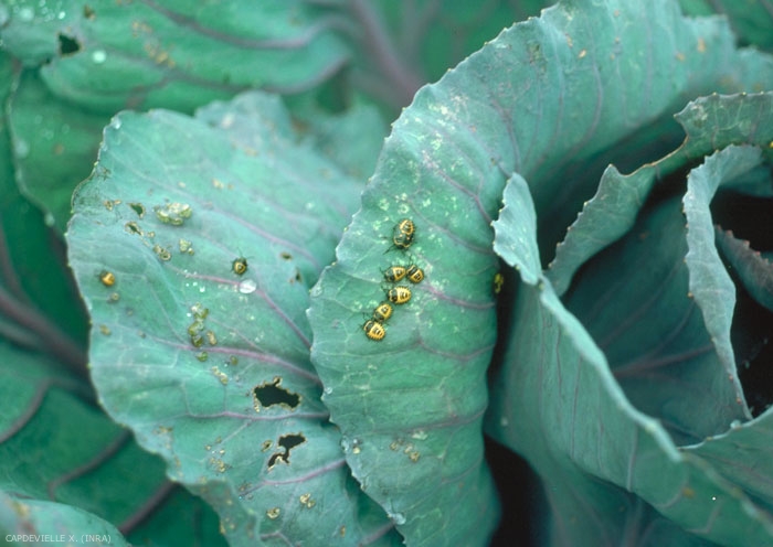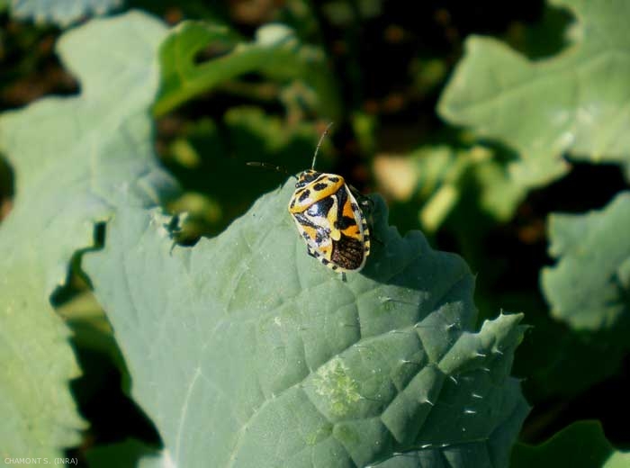 Ces punaises se nourrissent en piquant le limbe des feuilles et en ponctionnant les liquides cellulaires. Des piqûres en très grand nombre provoquent le jaunissement complet des feuilles et des siliques. Les jeunes plantes fortement attaquées peuvent mourir (figure 5).