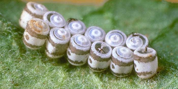 L'oeuf en forme de tonnelet a une couleur grisâtre avec des points noirs ainsi que 2 cercles noirs ; l'opercule est sombre en son centre (figure 3).