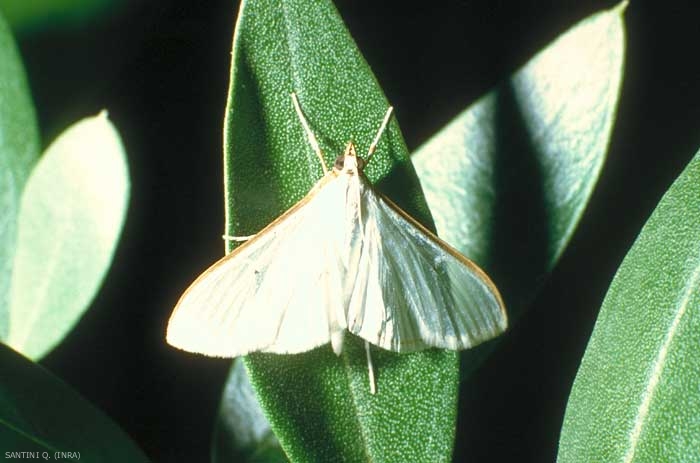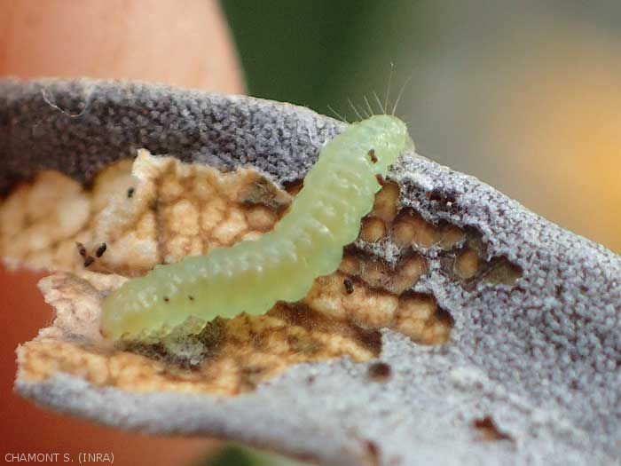 Les larves de 1er stade nouveau-nées décapent le parenchyme de la face inférieure des feuilles. Les chenilles s'alimentent de feuilles jeunes situées à l'extrémité des rameaux, en décapant d'abord une face, puis en découpant le limbe. Plus âgées, les chenilles provoquent des découpures dans les feuilles et peuvent détruire des bourgeons terminaux. Les chenilles de la 2ème génération s'attaquent aux olives en formation, les rongeant, parfois jusqu'au noyau.