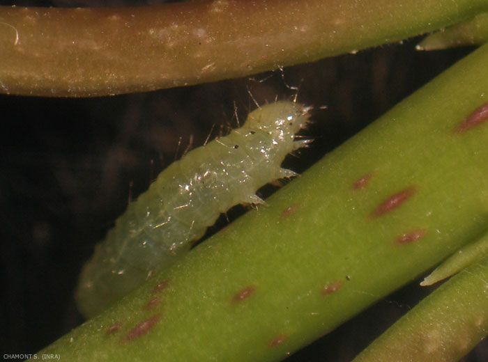 L'oeuf est de forme ovalaire, aplati, blanc jaunâtre, finement réticulé de 1 mm de long et 0,5 mm de large. La larve présente un corps jaune pâle à l'éclosion, devenant vert de plus en plus prononcé avec 3 paires de petites soies disposées latéralement sur chaque segment. A son complet développement, la chenille mesure 18 à 20 mm de long.