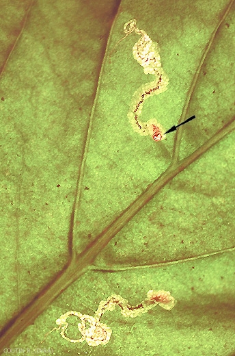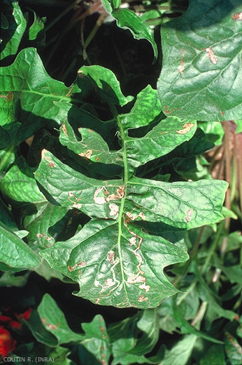 Le dégât principal est dû aux larves qui minent les feuilles (figure 2). Ces dégâts sont particulièrement graves sur les petites plantes en pépinière ou à peine transplantées, qui peuvent en mourir.