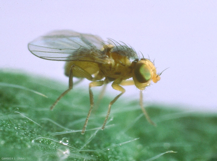 L'adulte est de taille réduite, il mesure 1,3 à 2,3 mm de long. Sa tête est jaune, le thorax et l'abdomen sont gris-noirâtre, les pattes et le scutellum jaune brillant (figures 1et 2). Le mâle est beaucoup plus petit que la femelle.