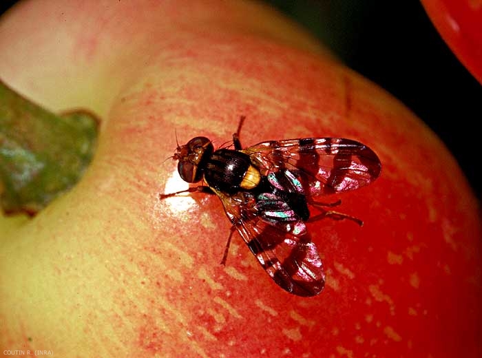 L'adulte est une petite mouche de 3,5 à 5 mm de long ; son corps est noir taché de jaune sur le thorax et la tête. les ailes transparentes avec 4 bandes foncées, bleu noir, leur donnent un aspect très caractéristique (figure 1). L'asticot est blanchâtre, de 4 à 6 mm de long (figure 2).