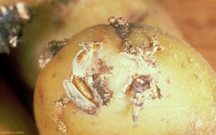 Par ailleurs, des champignons ou des acariens se développent dans les galeries, provoquant la décomposition du tubercule et le dégagement d'une odeur désagréable.
