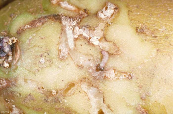 En cas de forte pullulation, on peut trouver 5 à 6 larves dans un tubercule de pomme de terre (figure 2) ; cependant, il suffit d'une seule chenille pour le souiller et le perdre.