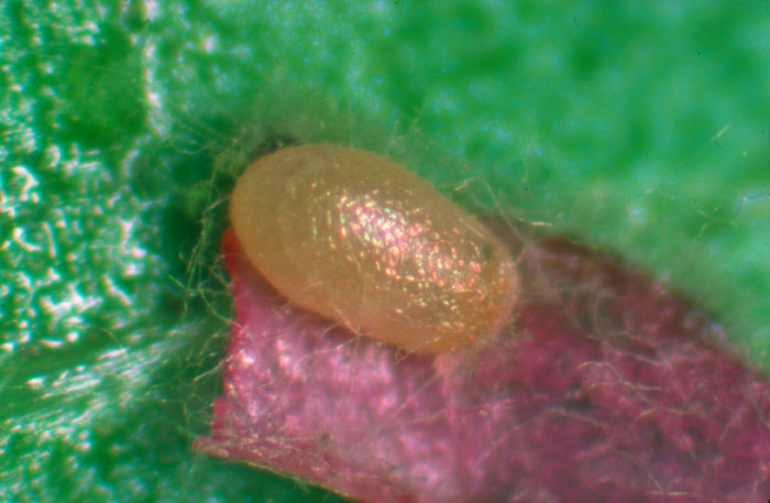 L'oeuf est blanc jaunâtre, très fragile, en forme de gélule d'à peine 1 mm de long (figure 2). La chenille atteint environ 14 mm à son complet développement. Elle est de couleur variable, jaune verdâtre à grisâtre sale, et striée longitudinalement de lignes pourpres ou carminées (figure 3 et 4). A la fin de son développement, elle se confectionne un cocon souple à larges mailles blanc grisâtre et se chrysalide.