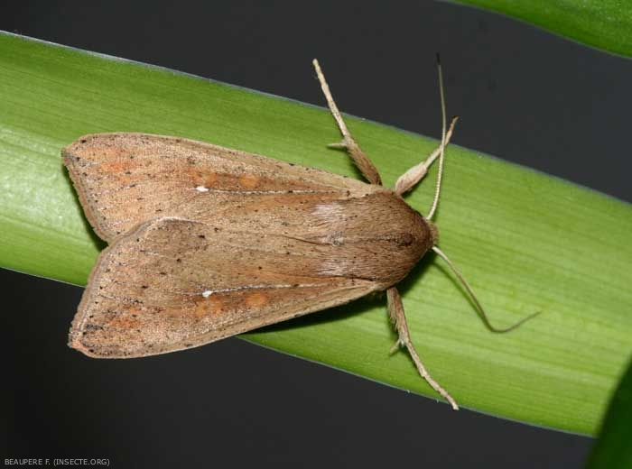 L'adulte est un papillon d'environ 35 mm d'envergure. Les ailes antérieures brun-acajou sont marquées au centre d'une petite tache blanche et, vers les extrémités, de petits points noirs disposés longitudinalement (figure 1). Les ailes postérieures sont gris sale.