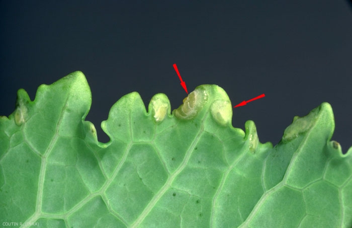 Les adultes éclosent en mai et juin, ils quittent le sol et s'accouplent le jour même. Quelques jours après, la ponte commence. Après s'être alimentées, les femelles incisent les feuilles latéralement à l'aide de leur oviscapte en dents de scie et déposent leurs oeufs un par un, dans les logettes, confectionnées de préférence sur des jeunes feuilles (figure 1). La fécondité d'une femelle est d'environ 300 oeufs.