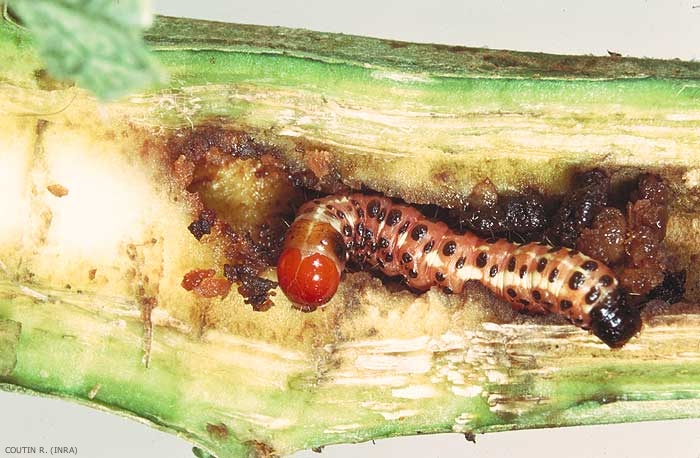 Les oeufs éclosent de façon échelonnée de décembre à février. La femelle pond jusqu'à 1 300 oeufs en 2 ou 3 groupes à la base des pieds de l'artichaut. Pendant 2 à 8 heures, la jeune chenille grimpe le long de la plante et mordille l'épiderme supérieur des feuilles ; puis elle pénètre dans les nervures, les perforant pour rejeter ses excréments. Elle mine ensuite la moelle de la tige et remonte dans le capitule qu'elle creuse de grosses galeries (figure 1). Les chenilles se développent dans la plante jusqu'à leur chrysalidation dans ces mêmes galeries (figure 2).