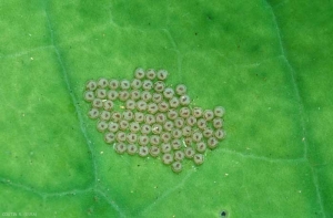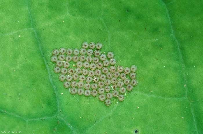 Les oeufs sont hémisphériques avec une petite protubérance centrale, ils sont groupés en plaques de 20 à 30 oeufs déposés à la face inférieure des feuilles (figure 2). La larve mesure 40 à 45 mm, le corps est glabre, vert à brun grisâtre avec une ligne médio-dorsale blanchâtre. Sur chaque segment, 4 gros points noirs sont disposés en carré (figure 3).