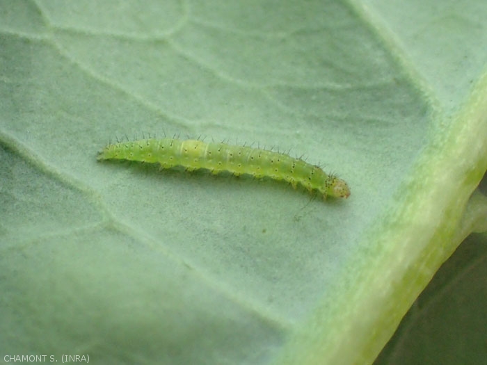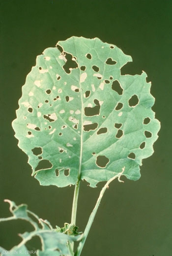 Les dégâts sont importants sur les choux. Les chenilles rongent d'abord les feuilles externes puis émigrent progressivement vers les jeunes feuilles du centre (figure 4). Elles les réunissent avec des fils de soie et les souillent de leurs excréments.