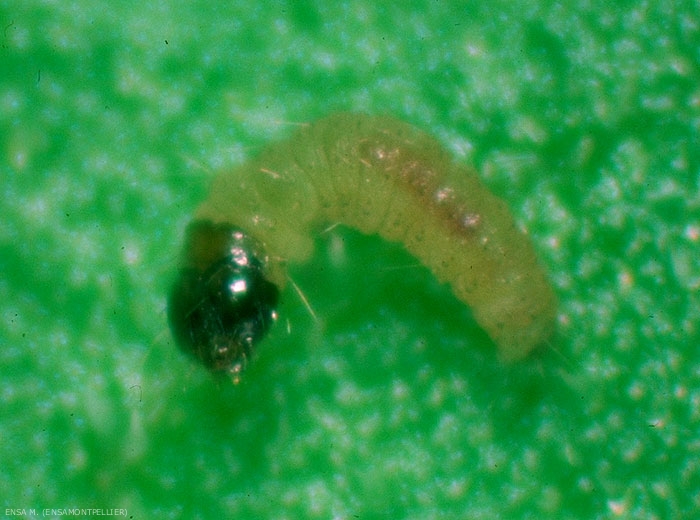 La chenille nouveau-née présente d'abord une phase errante et se nourrit de pollen. Elle pénètre ensuite dans les fleurons ou perce la base charnue des bractées entourant l'involucre, creuse des galeries dans le parenchyme médullaire du capitule, grignote la base des fleurons ou évide les graines de leur contenu. Elle ne vit qu'au niveau de l'inflorescence, jamais dans les tiges. A la fin de son développement, elle se laisse tomber sur le sol, s'enfonce de quelques cm, se confectionne un cocon et se nymphose, à moins qu'elle n'entre en diapause hivernale.