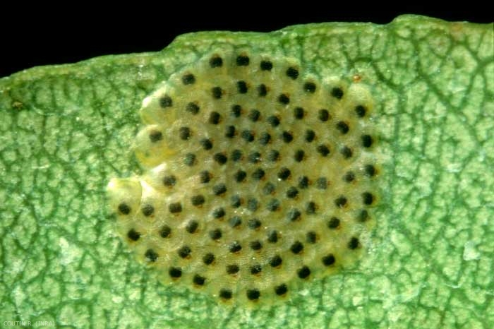 Les oeufs sont aplatis, pondus en groupe (ooplaque) de 20 à 100 à la face supérieure de la feuille du pommier ou à la face inférieure chez le poirier. L'ooplaque mesure 3 à 10 mm de diamètre, elle est jaune puis il y a présence de points noirs (les têtes des chenilles formées) ; à cet état, les oeufs sont prêts à éclore (figure 3). La larve mesure 18 à 22 mm. Elle est de couleur jaune verdâtre à vert olive. La tête et la plaque thoracique sont brun brillant chez la jeune chenille puis jaune miel (figure 4). Les pattes thoraciques sont brun clair. Par ailleurs elle est très agile.