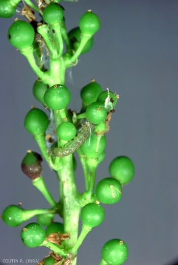 La durée de développement de l'embryon est de 6 à 9 jours pour la 1ère génération ; elle n'est plus que de 4 à 6 jours pour les générations suivantes, la température étant plus élevée. La larve de 1ère génération a un "stade baladeur" de quelques heures. Après s'être glissée entre 2 ou 3 boutons floraux, elle tisse quelques fils puis perfore les enveloppes florales et pénètre dans le bouton ; elle s'introduit parfois dans le pédoncule de la grappe et provoque le dessèchement de celle-ci. La chenille est active et tisse un fourreau relativement volumineux mais difficile à déceler. Les chenilles des générations ultérieures se déplacent quelques minutes seulement et se développent aux dépens des grains : elles en rassemblent plusieurs à l'aide de fils de soie puis les mordillent ou pénètrent à l'intérieur (figure 1).
