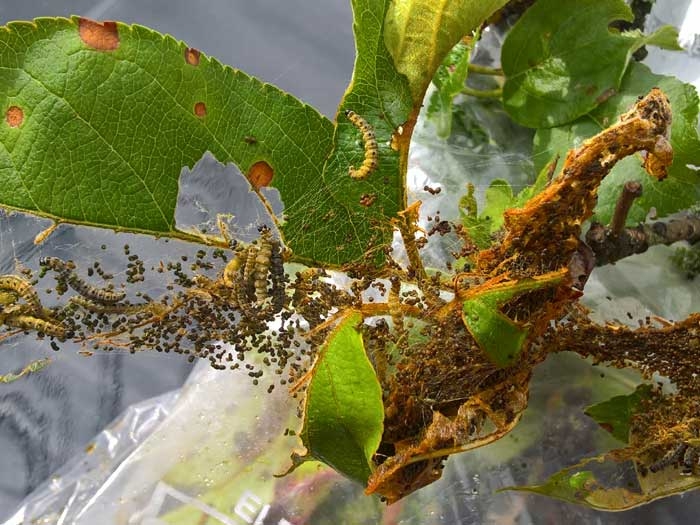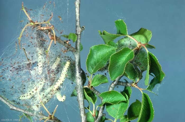 La chenille évolue principalement sur le pommier (Malus pumila), le prunier et l'aubépine (Crataegus sp.) ; elle peut également s'attaquer à l'amandier (Prunus dulcis).