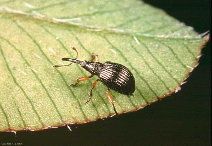 L'adulte mesure 2 à 3 mm, il est noir brillant. Le rostre est allongé et recourbé (figure 1). Les oeufs sont jaune verdâtre, très petits (0,5 sur 1,5 mm).
