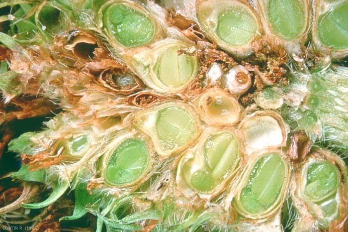 La durée de développement de l'oeuf dure 8 jours. La larve s'alimente aux dépens des graines en cours de formation, éventuellement des organes floraux (figure 1). Chaque larve détruit 7 à 8 graines en moyenne. Elle se nymphose dans le capitule attaqué. La durée de développement de la nymphose est généralement de 8 jours.