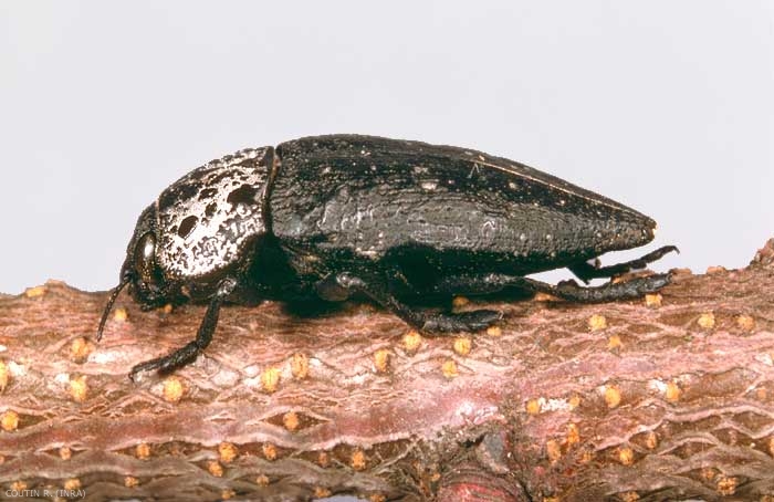 L'adulte mesure 15 à 25 mm. Le corps est gris-noir, très sclérotinisé (figure 1). Les oeufs mesurent 1,5 x 1 mm, ils sont blancs, ovoïdes ; déposés à la base du tronc ou dans le sol à proximité. La larve mesure 60 à 70 mm de long, elle est blanche, avec des mandibules fortes et noires. Le prothorax est beaucoup plus large que les segments suivants, aplatis et bien visibles ("larve marteau").