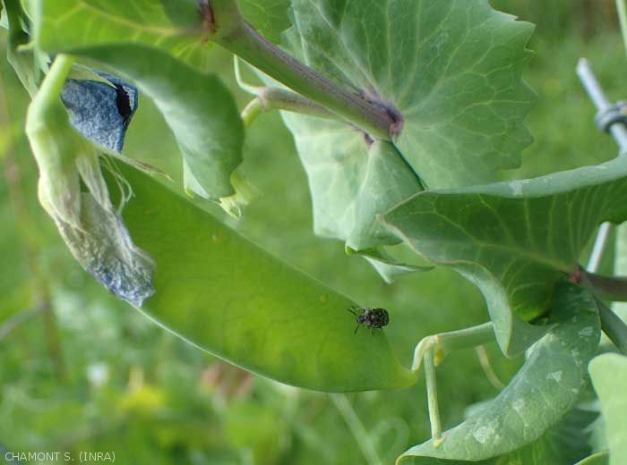 Cette bruche, strictement monophage, ne se développe que sur le pois (Pisum sativum).