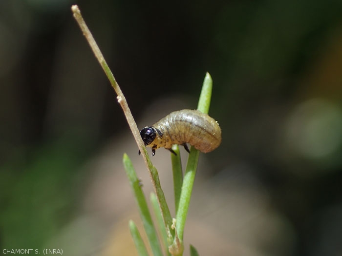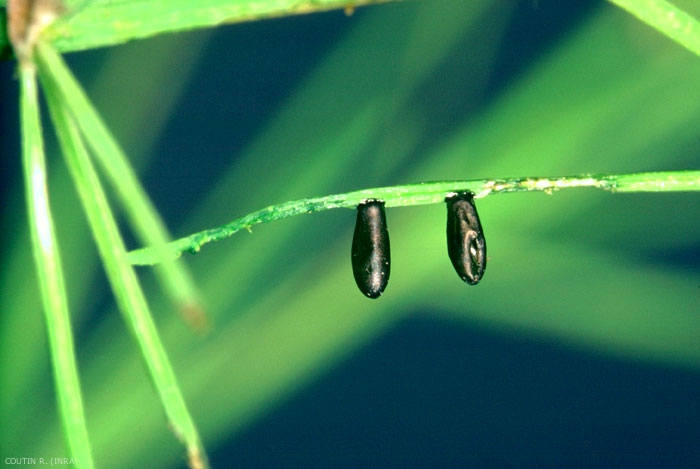 Les principaux dégâts sont dus aux larves qui rongent et détruisent toutes les ramifications vertes des turions réduisant considérablement ou totalement toute possibilité d'assimilation chlorophyllienne (figure 4).