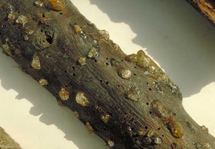 Les galeries de ponte, profondes, n'endommagent pas les arbres sains et vigoureux. Elles sont cependant capables de tuer des branches ou de jeunes sujets (figures 1 et 2) affaiblis par des champignons, comme Stigmina carpophila (agent de la maladie criblée) ou par des insectes tels que Monosteira unicostata (tigre de l'amandier) ou Aglaope infausta (zygène de l'amandier), ou encore par un stress hydrique.