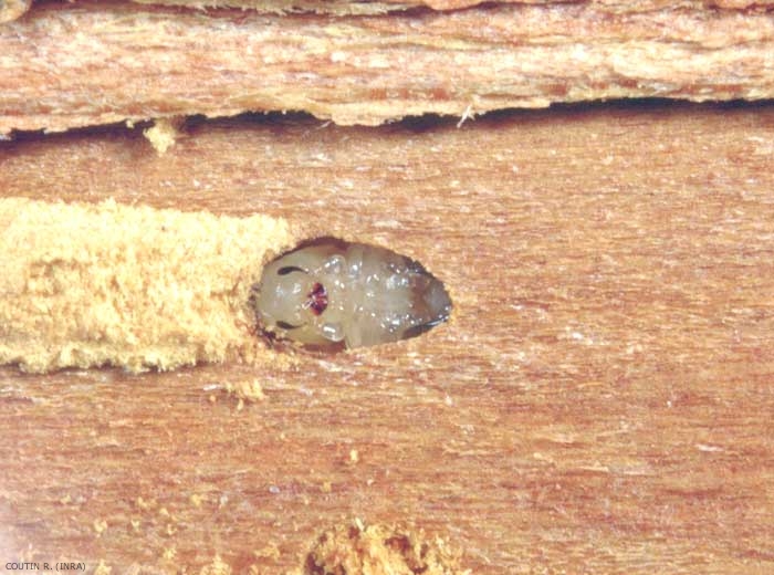 Dès son éclosion, chaque larve fore une galerie, à la limite du bois et de l'écorce dont elle se nourrit. Les galeries larvaires partent en rayonnant du couloir maternel, elles sont sinueuses et s'entrecroisent souvent à leur extrémité. Leur calibre s'accroît au fur et à mesure que la larve grossit. Les larves se développent pendant le printemps et l'été et, selon les régions, peuvent se nymphoser et être à l'origine d'une nouvelle génération (figure 1). A l'approche de l'hiver, les larves entrent en diapause dans la logette nymphale. La larve se nymphose dans cette logette située à l'extrémité de la galerie. Celles qui n'ont pu se confectionner cette logette meurent avant la nymphose qui a lieu en mars (figure 2).