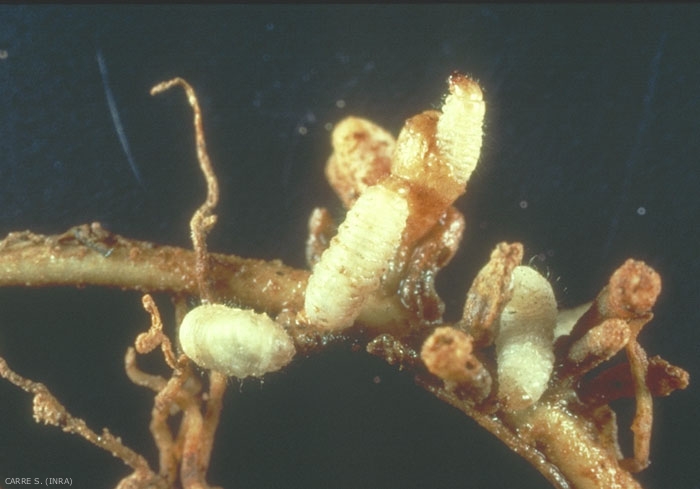 La durée d'évolution embryonnaire est de 2 à 3 semaines. La larve nouveau-né (0,5 mm) s'enfonce dans le sol et vit aux dépens des nodosités bactériennes (figure 1). Ensuite, parvenue à 2 mm de long, elle s'attaque aux radicelles et aux racines. L'évolution larvaire dure 30 à 40 jours. La nymphose a lieu dans une petite coque terreuse dans le sol et dure 10 à 20 jours. Les adultes de la nouvelle génération apparaissent de juillet à fin août avec un maximum vers le 15 juillet.