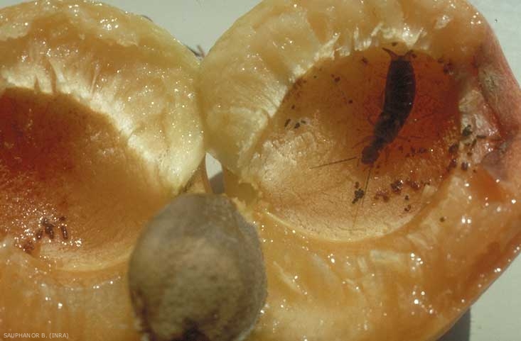 Des dégâts moindres affectent les pommes et les poires (région méditerranéenne, figure 2), la betterave à sucre et le chou-fleur (nord de l'Europe). La forficule attaque les fruits mûrs, qui présentent des morsures en cupule de 3 à 10 mm de diamètre (figure 3). Ces blessures, ainsi que les tentatives de pénétration, peuvent favoriser l'installation de maladies fongiques comme la moniliose. Dans certains cas, la forficule est plutôt un auxiliaire et peut détruire, même sur les cultures précitées, des ravageurs comme les pucerons (figure 4).