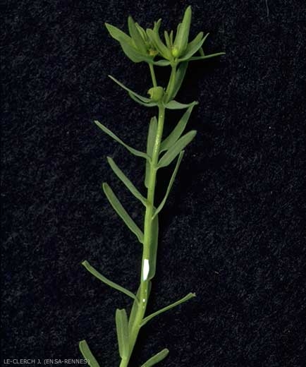 Feuilles inférieures opposées, les suivantes alternes. Feuilles inférieures rapprochées, petites, sessile. Feuilles suivantes linéaires à bord entier et sommet épineux ou tronqué. Présence de latex blanchâtre
