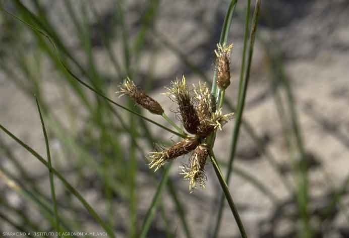 Fleurs à écailles roussâtres avec des bords pâles présentant 2 dents avec une assez longue pointe au milieu de l'échancrure. Ovaire surmonté d'un style de 2 ou 3 stigmates. Épillets ovoïdes-oblongs (1 à 2 cm de long), certains possédant des pédoncules simples et inégaux