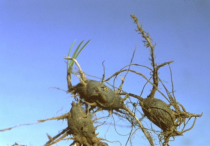 Rhizomes filiformes à tubercules intercalaires. Tubercules noirâtres zonés, amers, long de 20 à 40 cm.