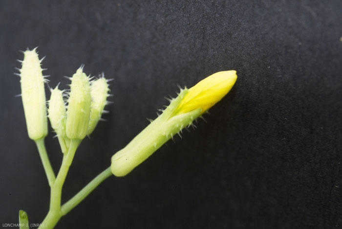 Fleurs blanches ou jaunes, à veines violettes apparentes. Sépales dressés verticalement, garnis de soies
