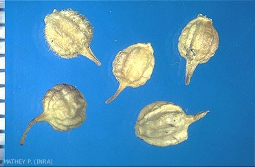 Fruits: silicules coriaces indéhiscentes, en 2 parties distinctes ; article inférieur cylindrique contenant une graine et article supérieur sphérique, ovale, prolongé par un style filiforme.