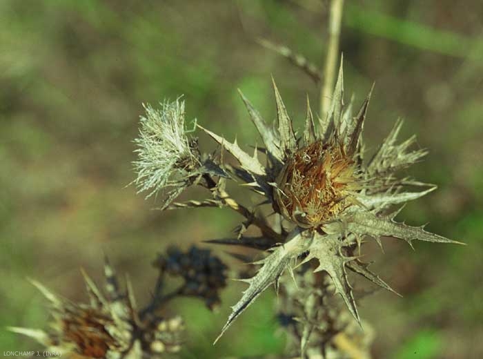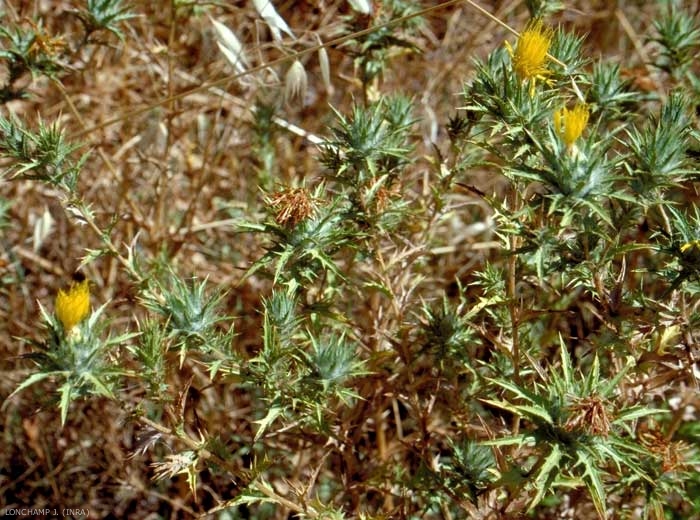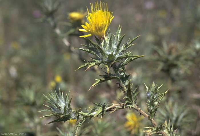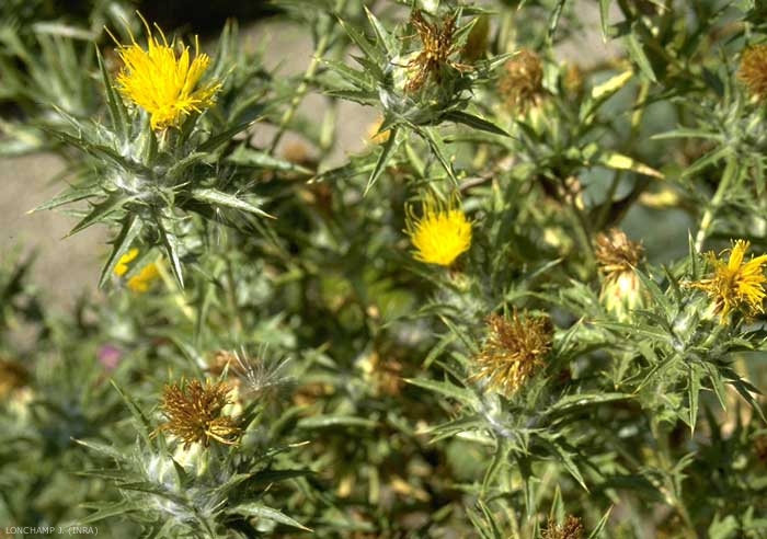 Fleurs jaunes, veinées de rouge en capitules isolés au sommet des rameaux. Involucre gros, subglobuleux, à bractées pennatifides, épineuses