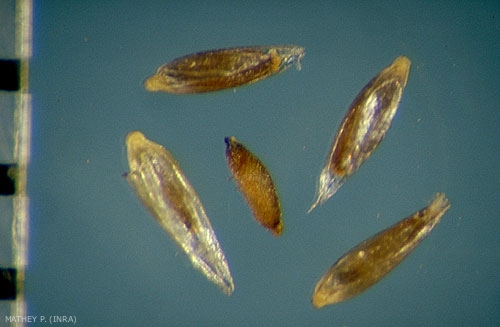 Caryopse allongé, plus de 2 fois plus long que large, présentant un sillon longitudinal marqué. Cicatrice basale proéminente, galbe.