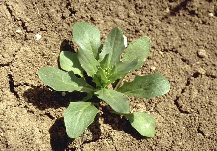 Feuilles inférieures en rosette lâche, glabres, lisses, tout d'abord ovales arrondies, nettement pétiolées, plus tard lancéolées ovales, échancrées à dents espacées. Feuilles de la tige alternes, sinuées dentées, sessiles et embrassantes par 2 oreillettes aiguës ;