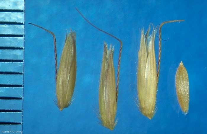 Fleurs stériles plus développées que les fertiles, avec fréquemment une longue arête (> 7 mm) basale coudée, torsadée dans sa première partie. Lemme du fleuron fertile portant souvent une courte arête subterminale.
