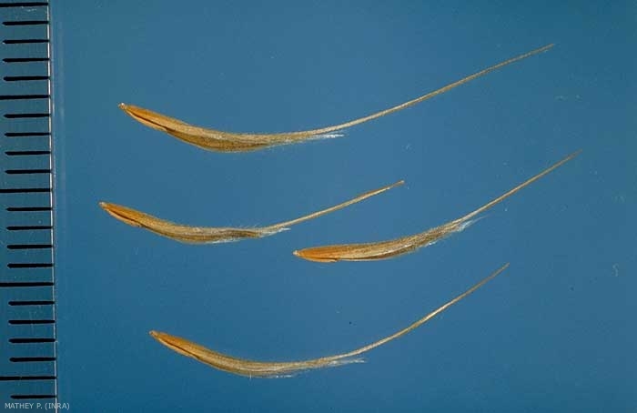 Semence généralement dispersée avec 1 fleur entourée des glumelles. Présence d'une baguette à la base de la glumelle inférieure (lemme), baguette de 2 mm