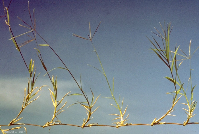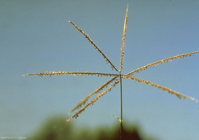 Inflorescence constituée par 4 à 7 grappes spiciformes digitées très grêles pouvant atteindre 5 cm. Épillets isolés, alternes. Glumes presque égales, un peu étalées, aiguës, scabres, sur la carêne. Glumelles dépourvus d'arête, pliées-carénées