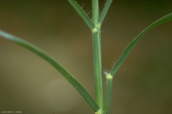 Ligule surmontée par une ligne de poils, limbe non auriculé à la base, touffes de poils de part et d'autre de la base du limbe.