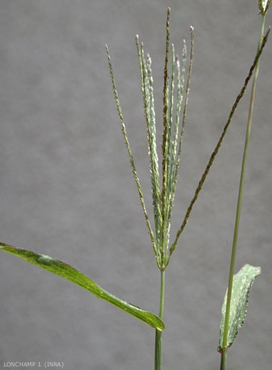 Inflorescence avec 4 à 10 grappes spiciformes, digitée, à épillets sur de courts pédicelles uniflores, glumes inférieures très petites, glumes supérieures aussi longues que l'épillet, recouvertes de poils fins, glumelles stériles aiguës