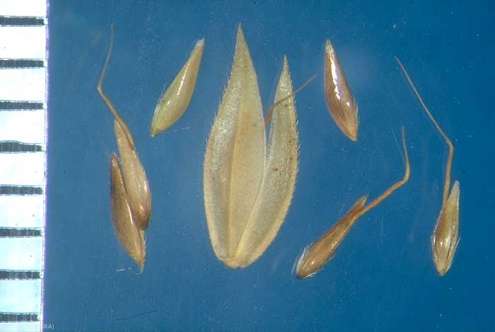 Glumes égales, dépassant les fleurs, sans longs poils blancs, arête de 4 mm dorsale ou subterminale, genouillée, portée par la lemme stérile
