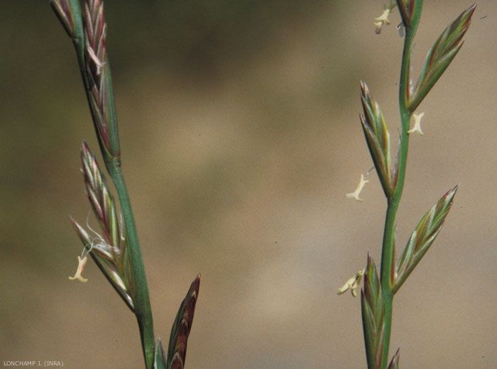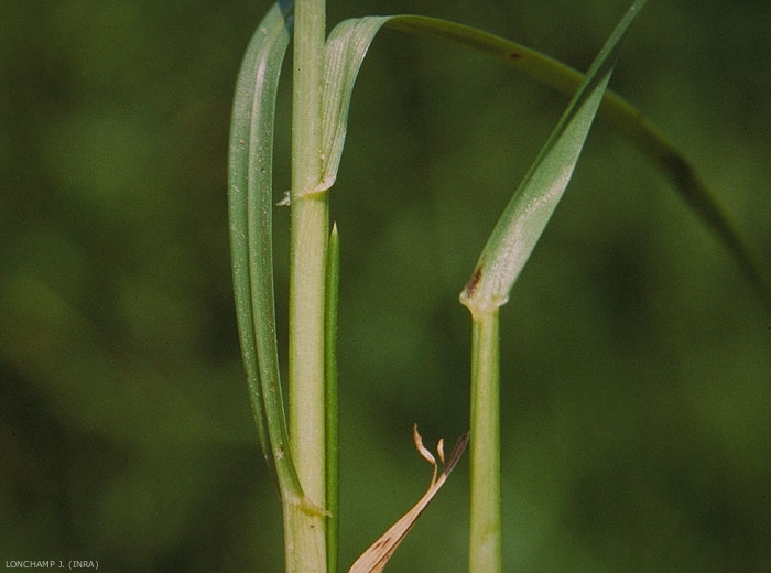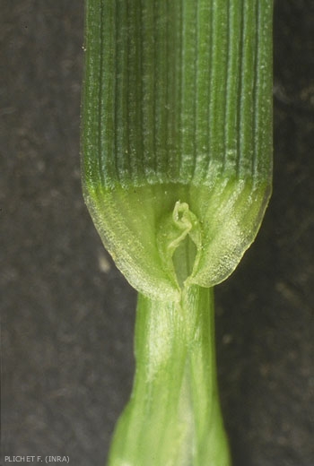 Tige lisse, également au dessous de l'épi. Présence d'oreillettes, glabres mais très courtes, nervures bien visibles, des gaines rouge violacé à la base