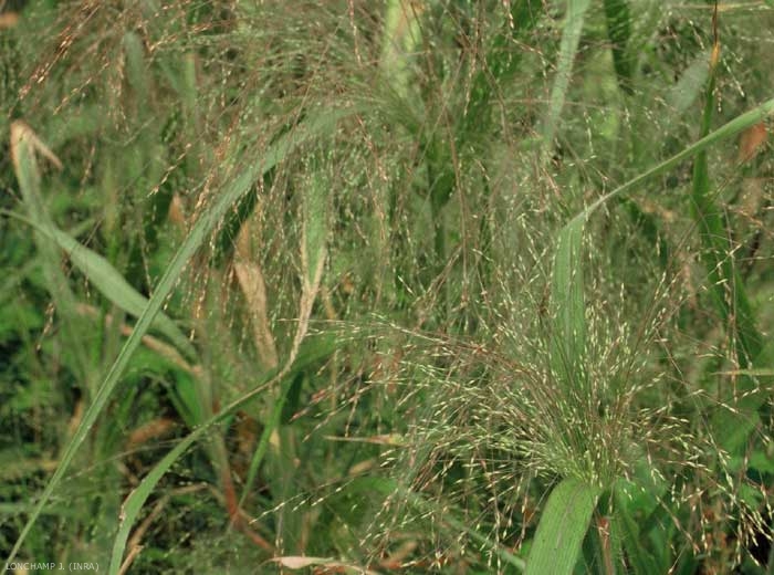 Inflorescence verte ou violacée. Grande panicule étalée et dressée. Épillets oblongs, petits (2 à 2,5 mm). Glumelle stérile unique.