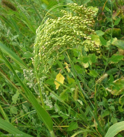 Inflorescence : panicule allongée, penchée au sommet, verte, à rameaux longs et dressés ;