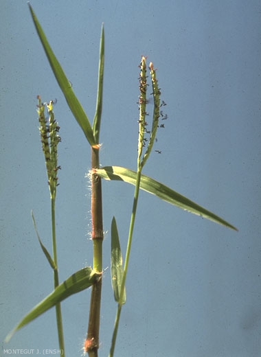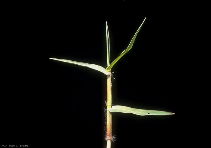 Feuilles linéaires, carénées à la base, à limbe un peu soudé au sommet, glabre. Gaine ciliée ; noeud dégagé hérissé de poils ;