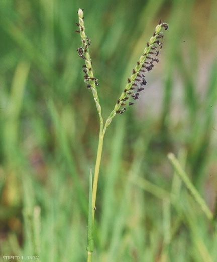 Inflorescence à épillets ovoïdes, aigus, longs de 3 mm, ordinairement disposés en 2 épis, parfois 3 épis. Épis étroits et courts (2 à 3 mm x 20 à 40 mm), denses et vert pâle, tachés à la floraison, étamines et stigmates noirs.