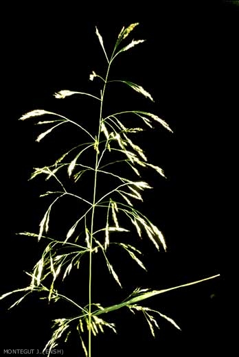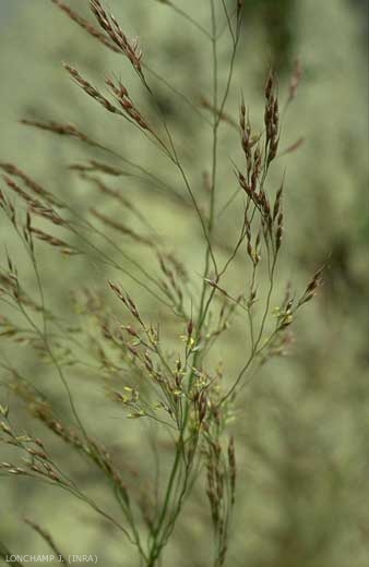 Inflorescence : panicule de grande taille à multitude de rameaux très divisés mais bien regroupés en verticilles successifs. Longs pédicelles portant des épillets isolés ne dépassant pas 4 mm mais dépassés par une arête au moins de la même taille. L'épillet contient une seule fleur fertile entourée des 2 glumelles, la fleur est masquée par les grandes glumes. Glumelle inférieure assez coriace et luisante, très embrassante ;