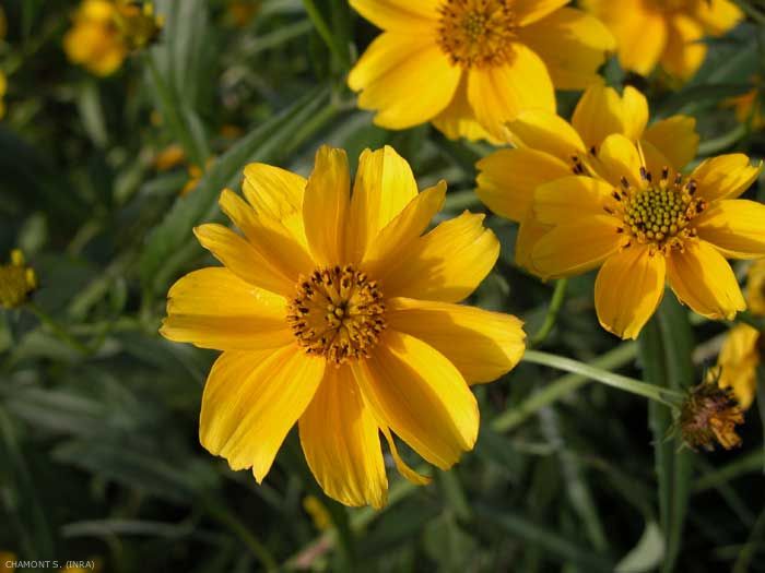 Fleurs jaunes ligulées, 5 à 6 striées de pourpre, de 10 à 30 mm, réunies en capitule. Fleurs odorantes à parfum de miel. Bractées de l'involucre de même taille, les externes non foliacées. Écailles du réceptacle aussi longues que les akènes