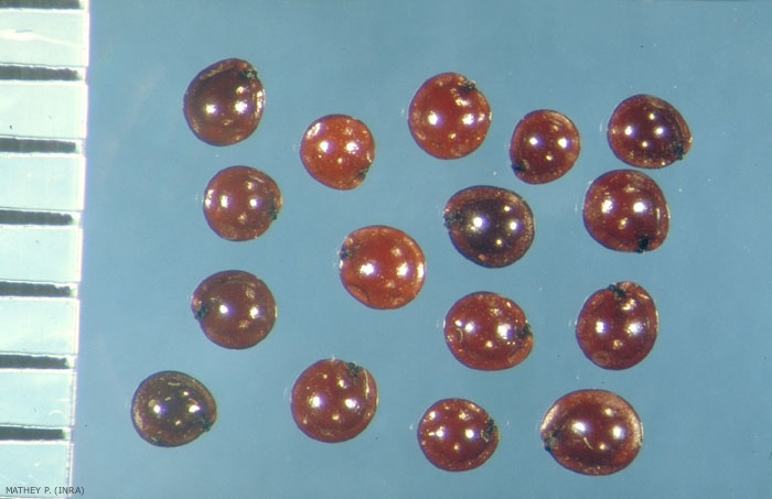 Dimensions : graine : 0,4-0,6 x 0,6-0,8 ; fruit : 1,2-1,4 x 2,0-2,5 mm